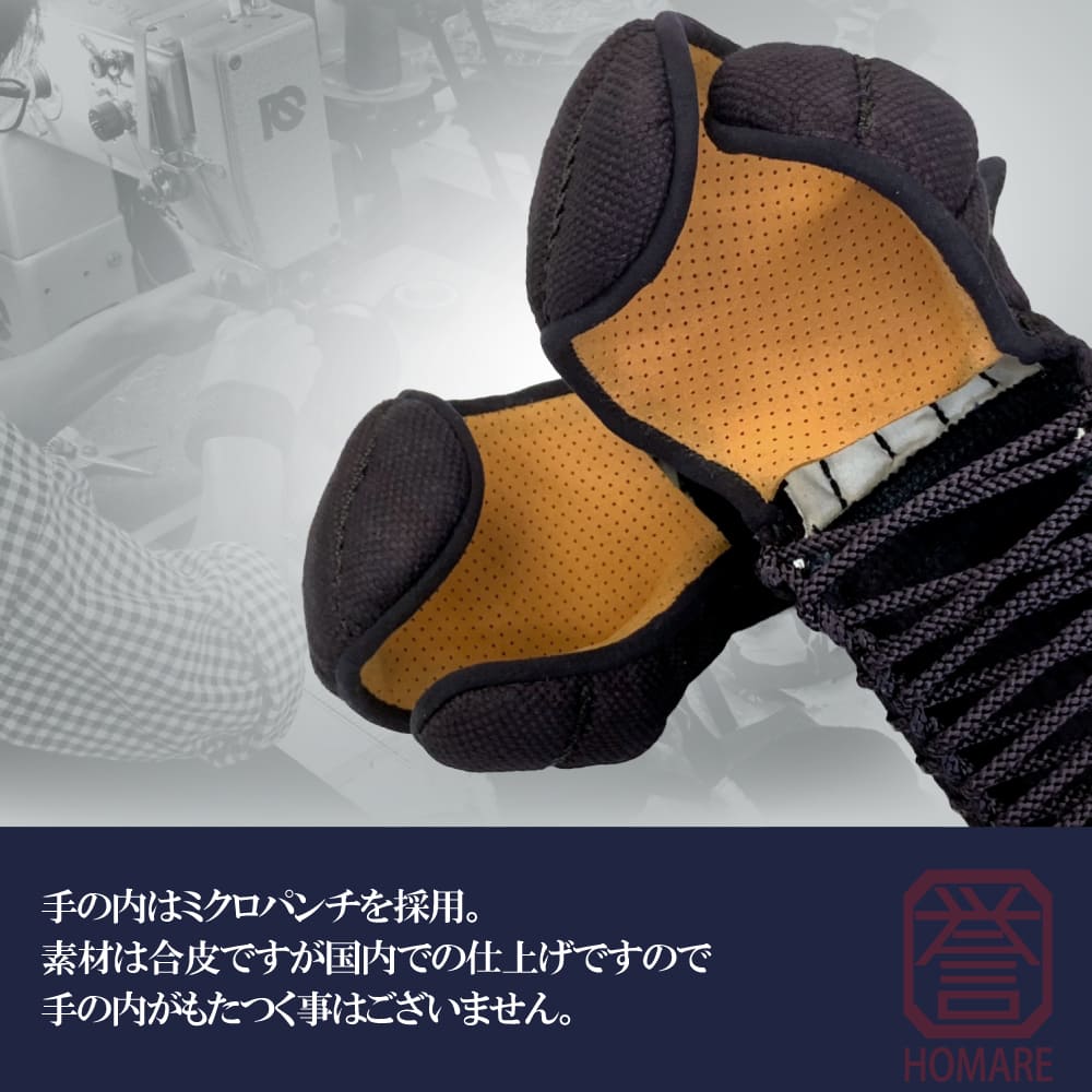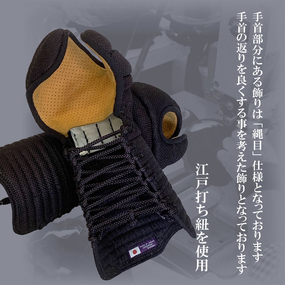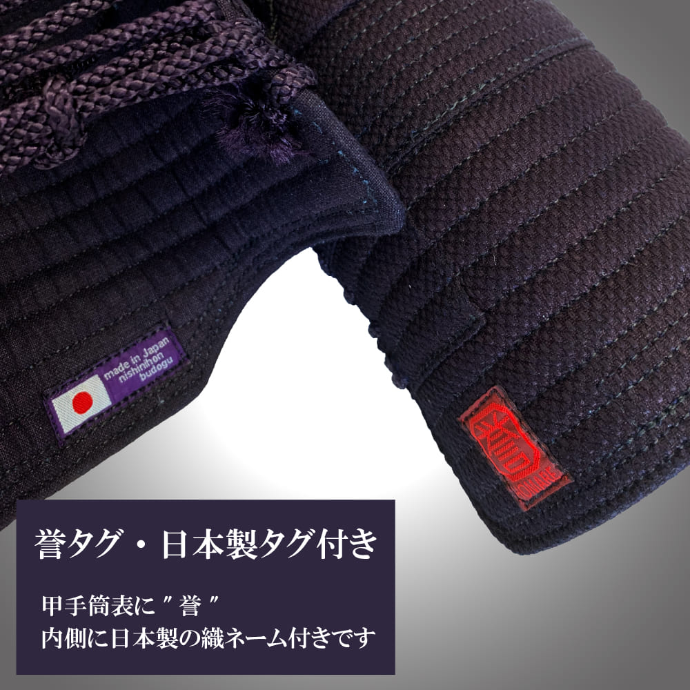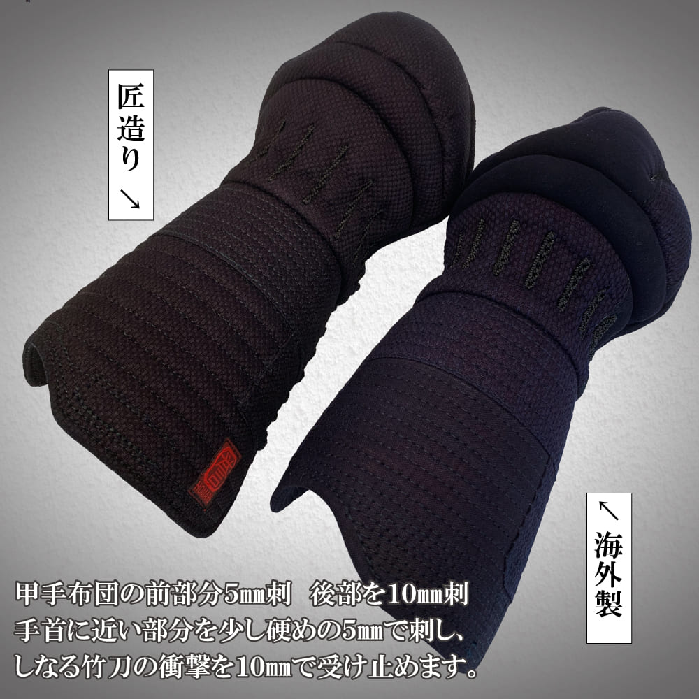 左に比べ右手甲手布団は僅かに厚みを持たせておりますので打突時の衝撃を緩和します。