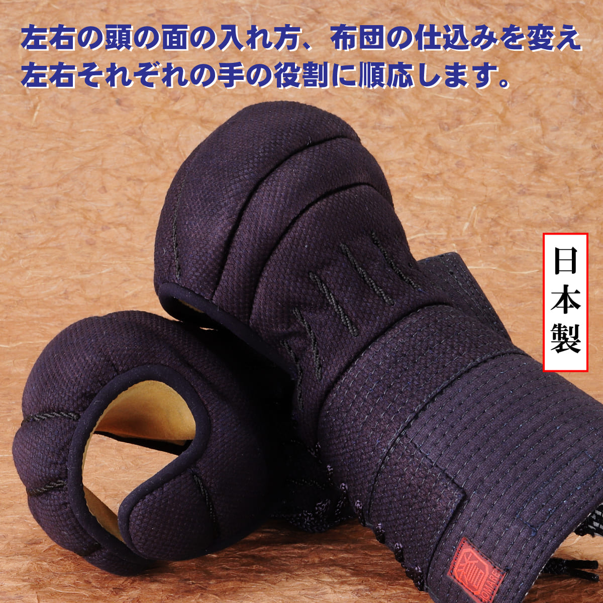 左右の甲手頭の綿の詰め方、布団(甲手ひじ)の仕込みを変え、左右それぞれの役割に順応しております。