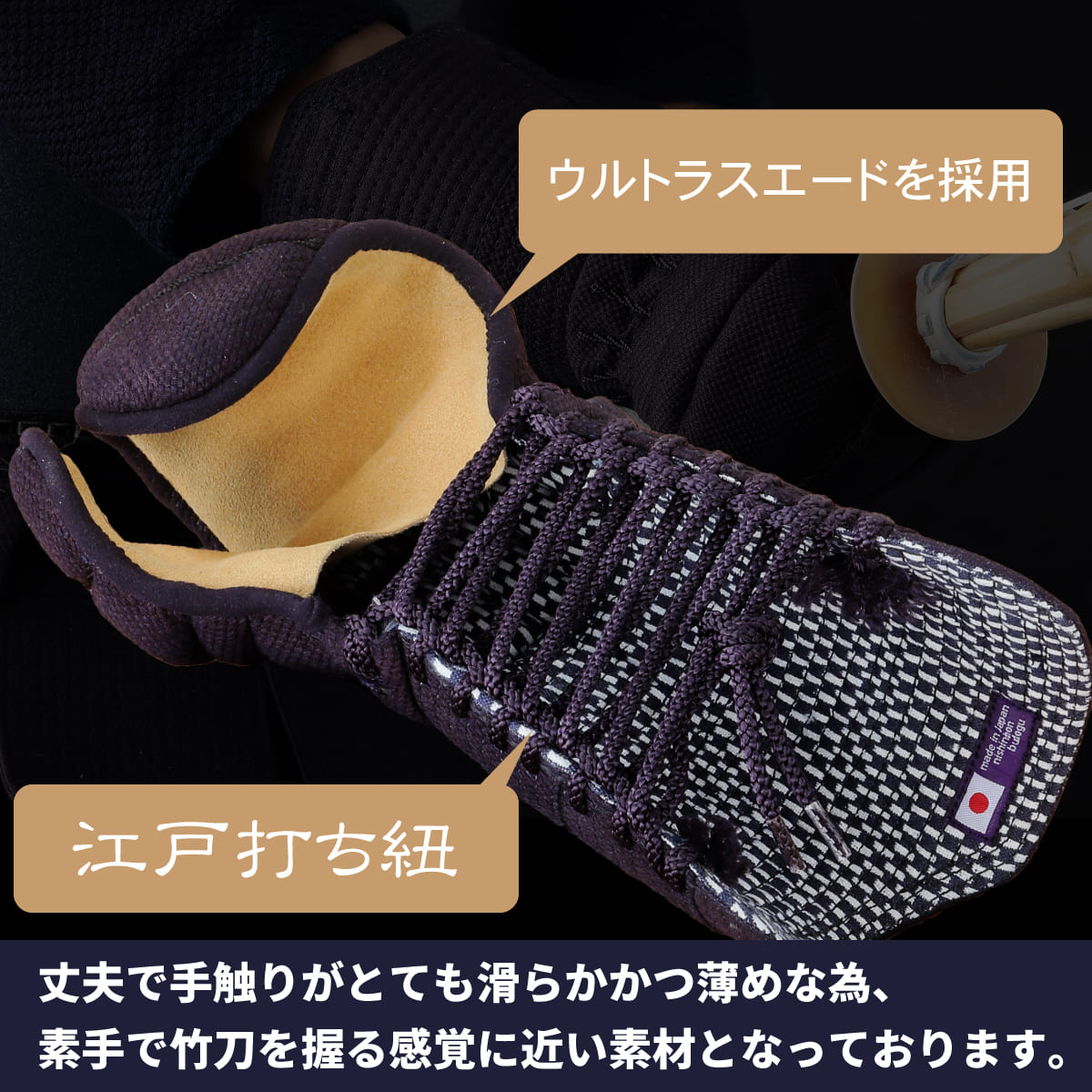 丈夫で手触りがとても滑らか、薄めな為素手で竹刀を握る感覚に近い素材となっております。
